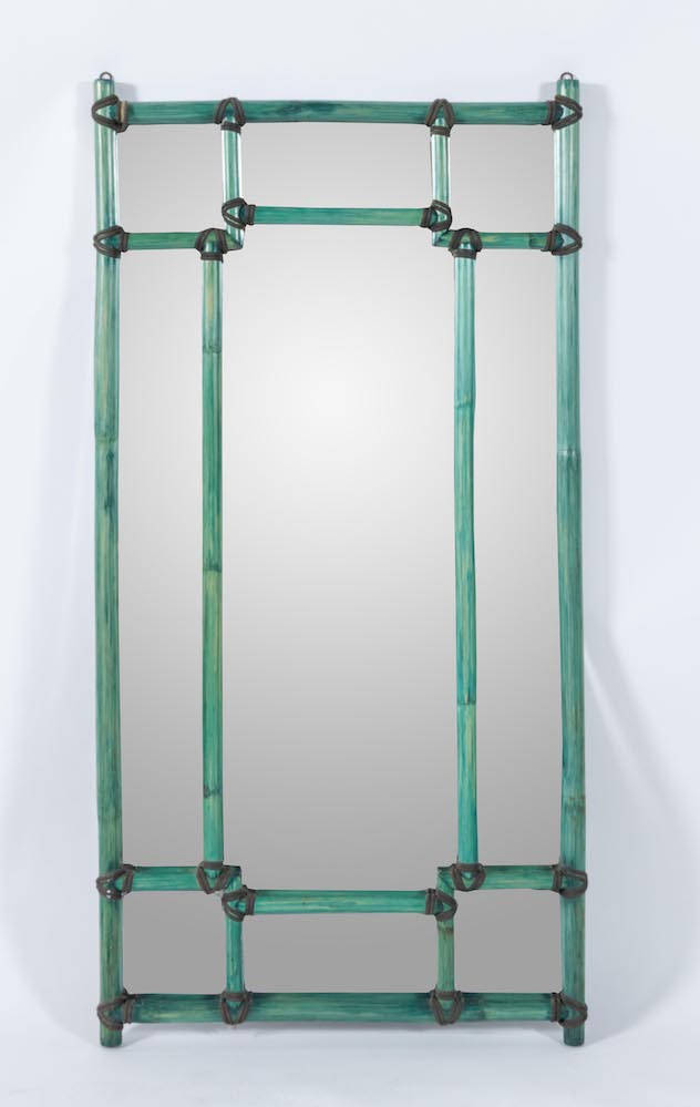 Specchio in bamboo con legature in cuoio; e vetro. Prod. Italia, 1980 ca. Cm 120x60x3.