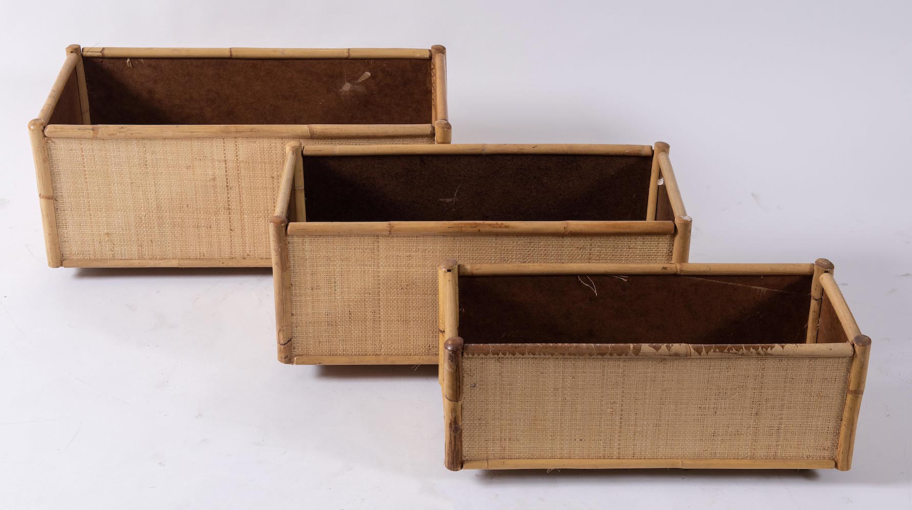 Tre fioriere in bamboo con pannelli in midollino intrecciato. Prod. Italia, 1980 ca. Rispettivamente di cm 31x68x33,5; cm 25,5x62x28 e cm 521,5x7x22.