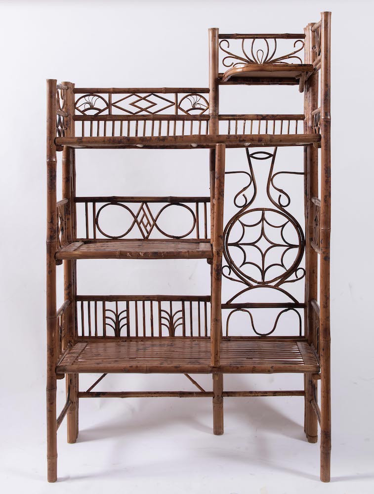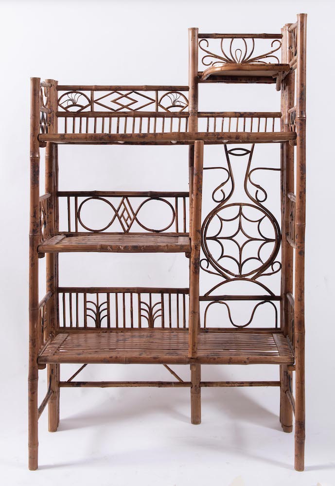 Mobiletto con mensole in bamboo e canna d’india. Prod. Italia, 1970 ca. Cm 130x77x33.