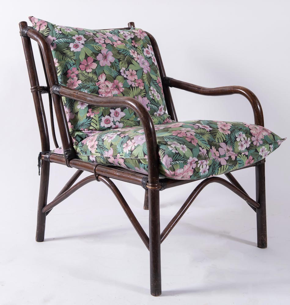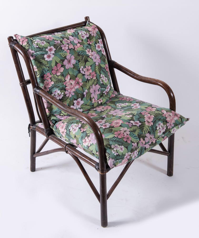 Lotto 160 | Poltrona in vimini e bamboo con seduta in tessuto. Prod. Italia, 1970 ca. Cm...