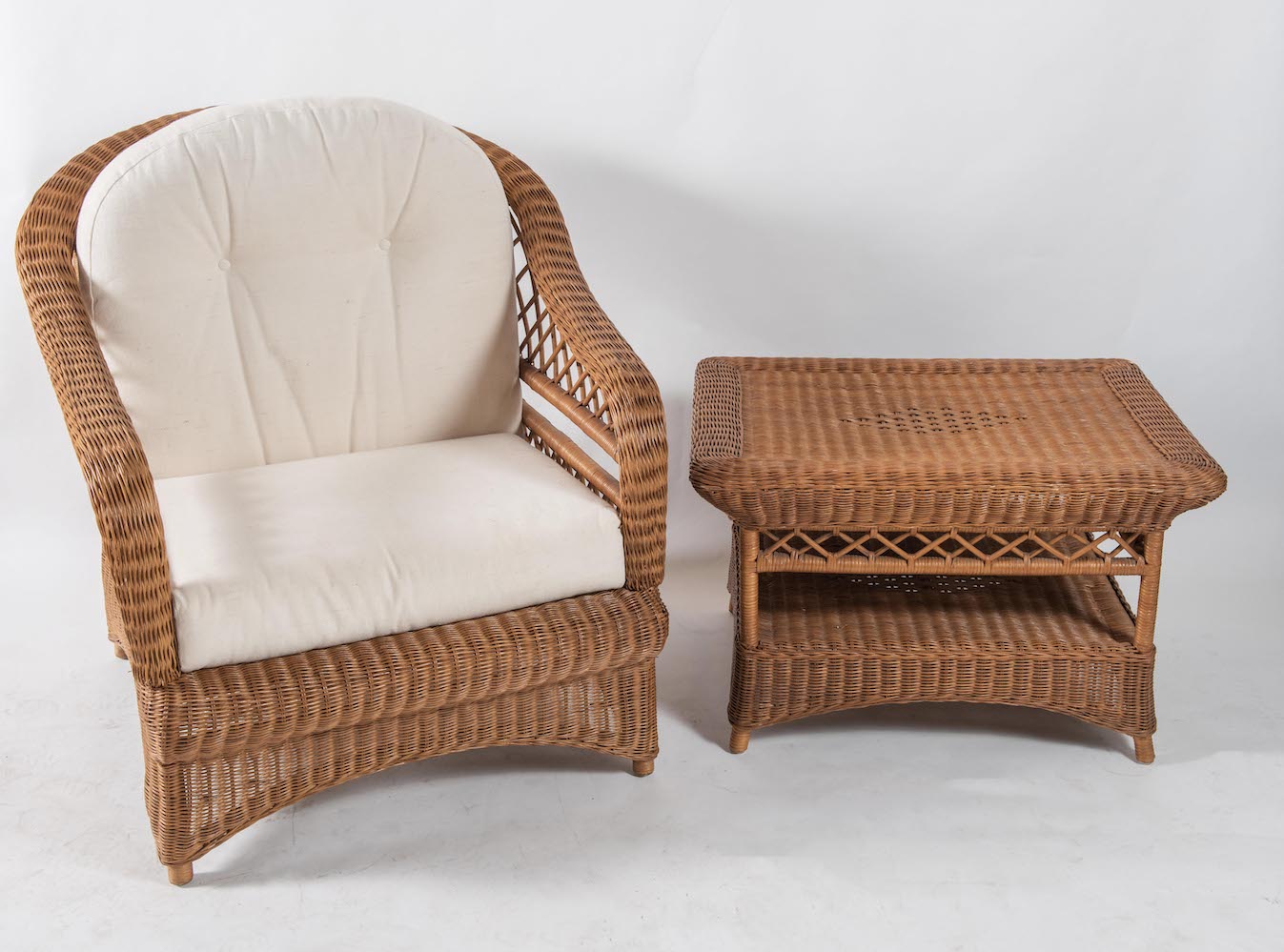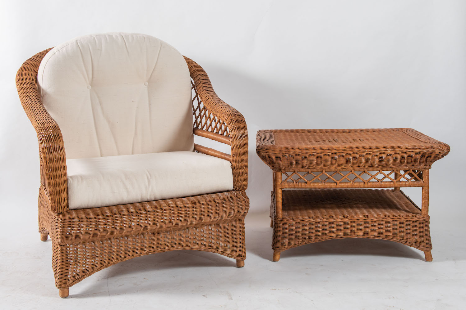 Poltrona e tavolino da caffè con doppio piano in midollo intrecciato e...