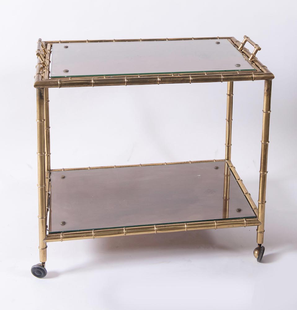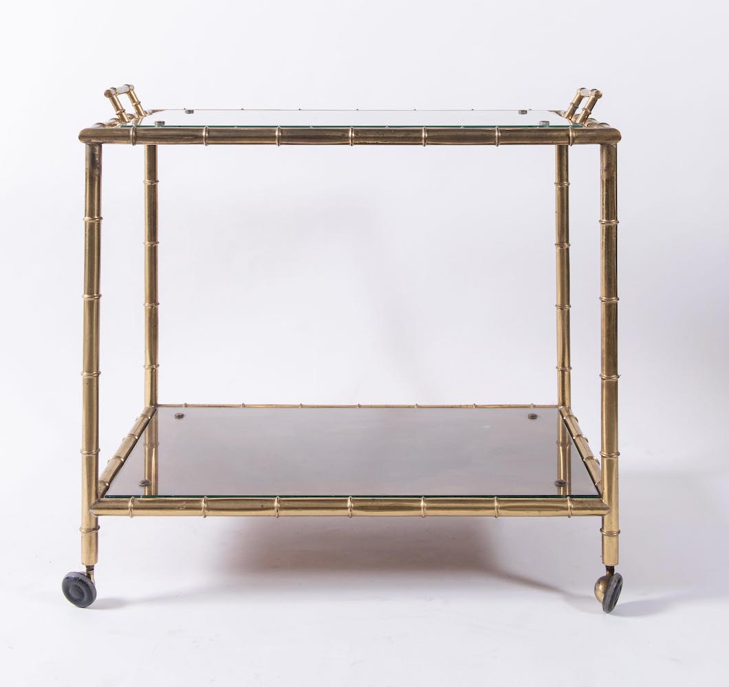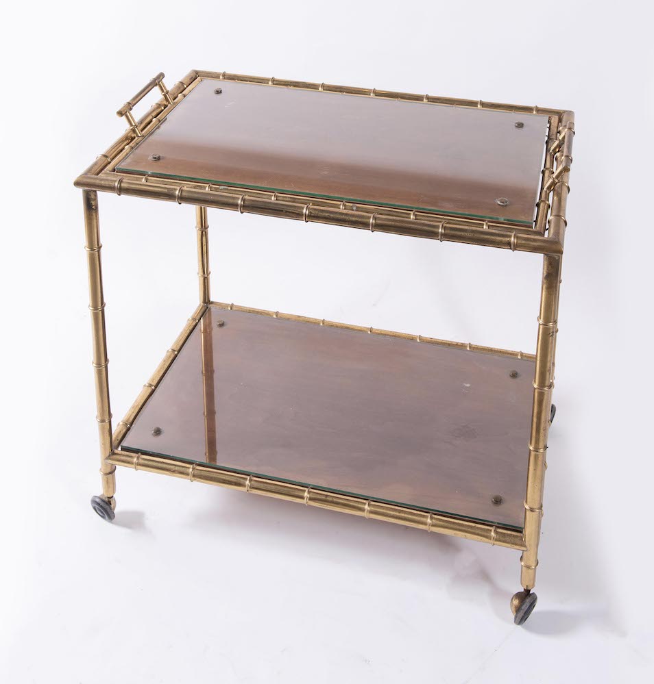 Carrello in ottone e vetro con piani in legno. Prod. Italia, 1960 ca. Cm 80x50x70.