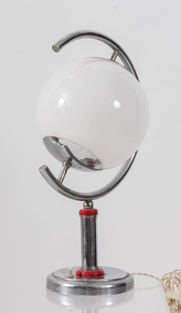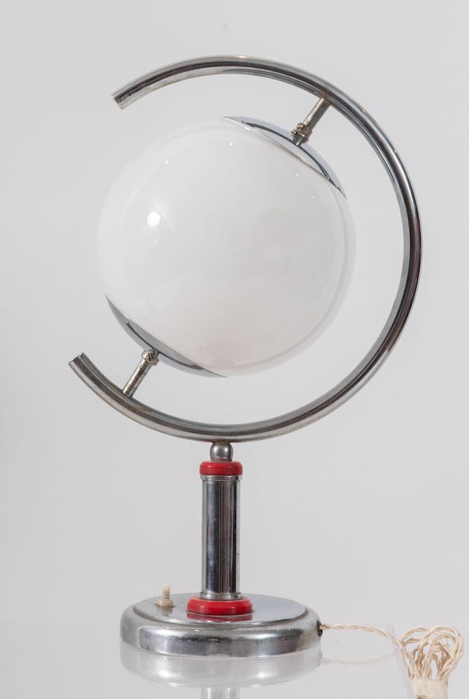 Lampada in metallo con sfera in vetro. Prod. Italia, 1940 ca. Cm 48x26x26.