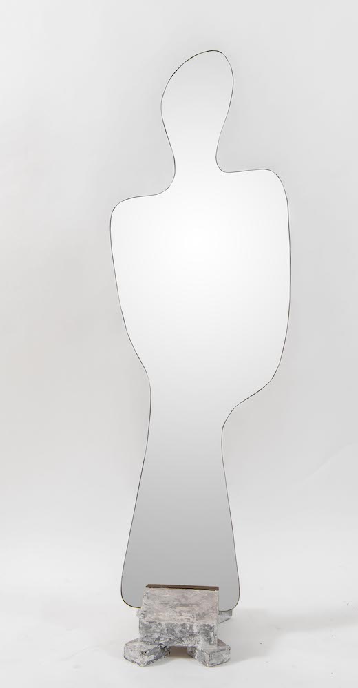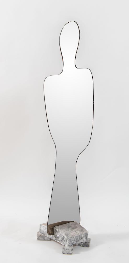 Specchio con sagoma di uomo e base in pietra. Prod. Italia, 1980 ca. Cm 148x45,5x35.