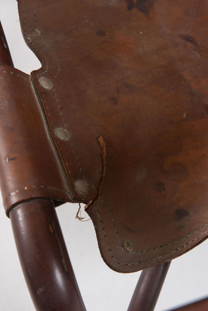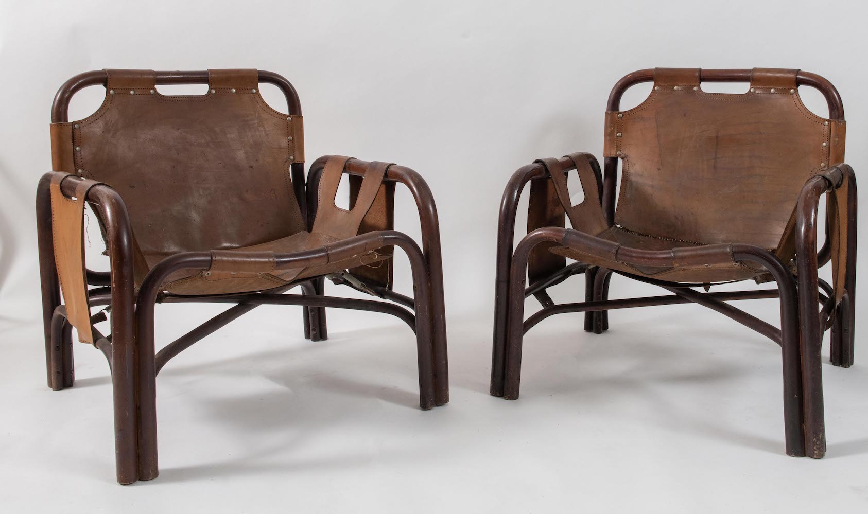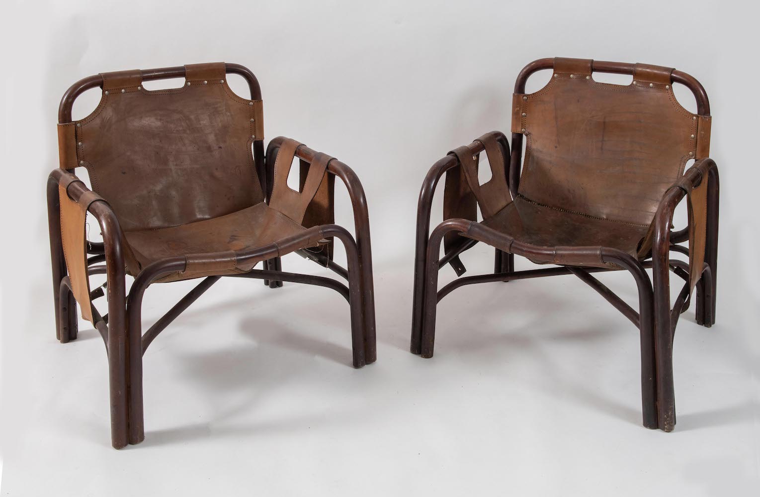 TITO AGNOLI, attr. Coppia di poltrone in bamboo rivestite in pelle. Con difetti. Prod. Bonacina, Italia, 1960 ca. Cadauna di cm 69x73x66.