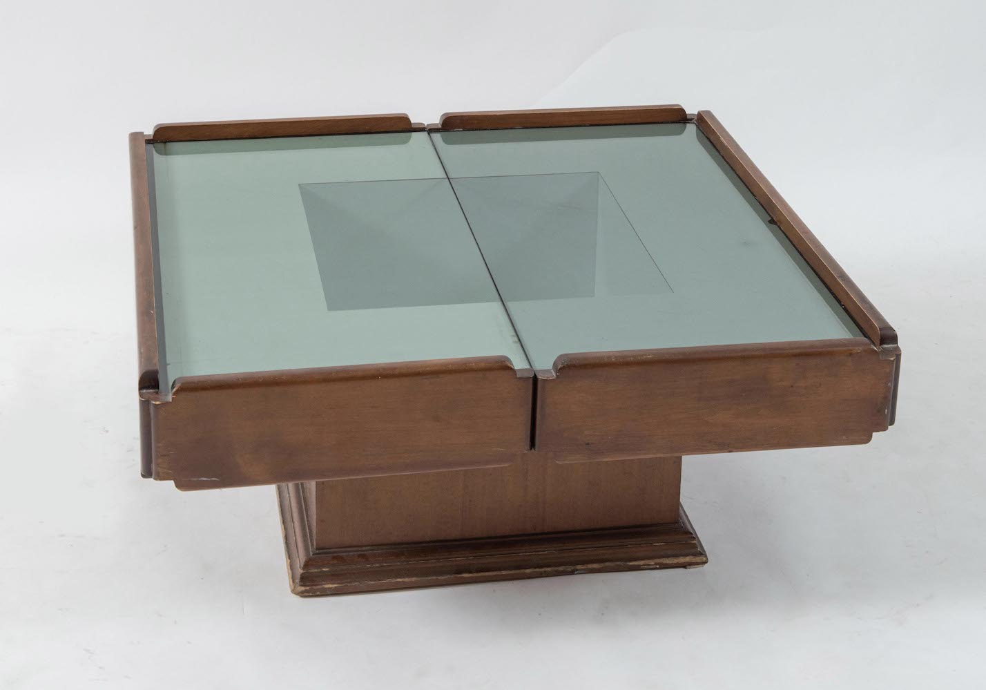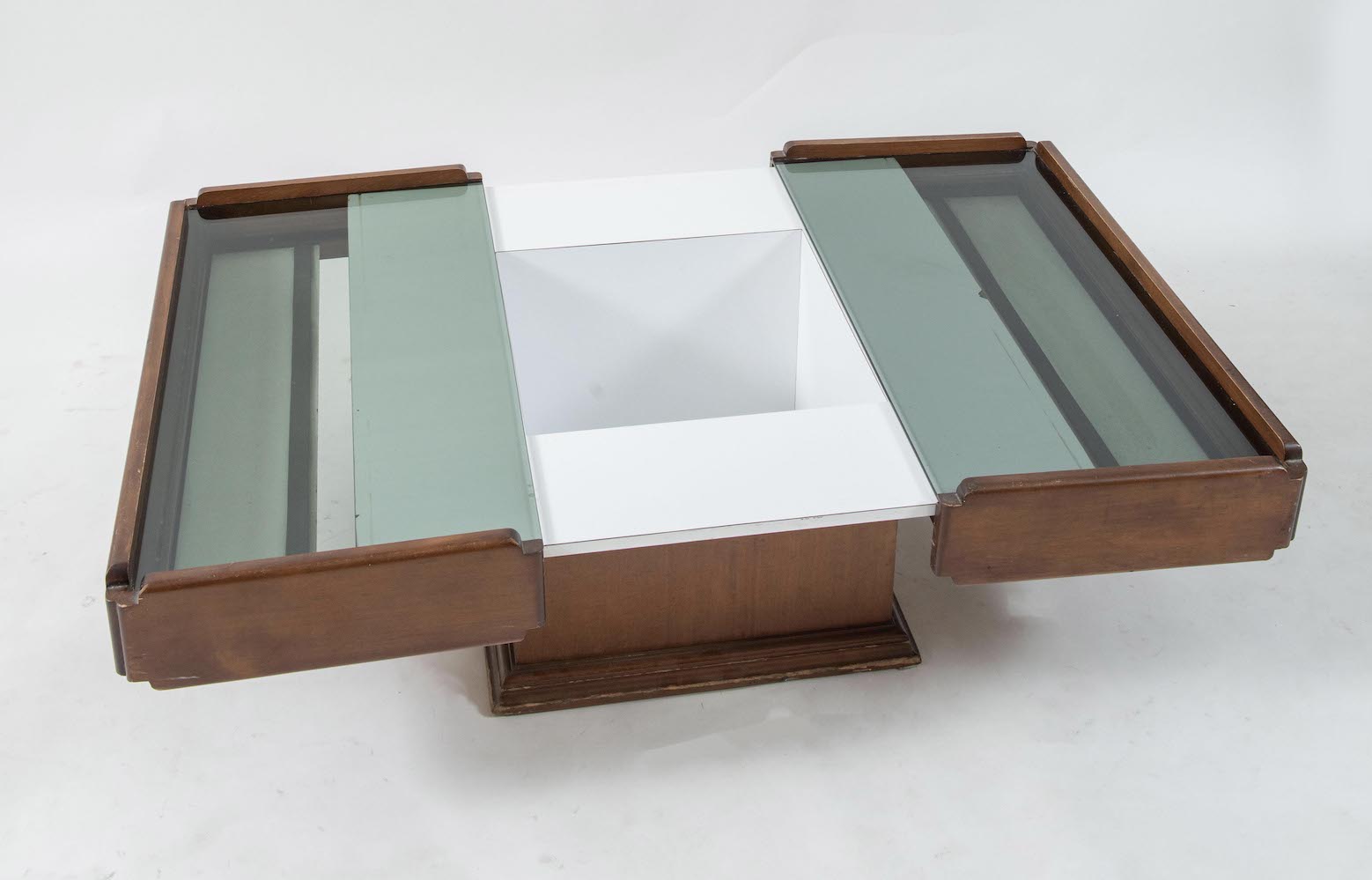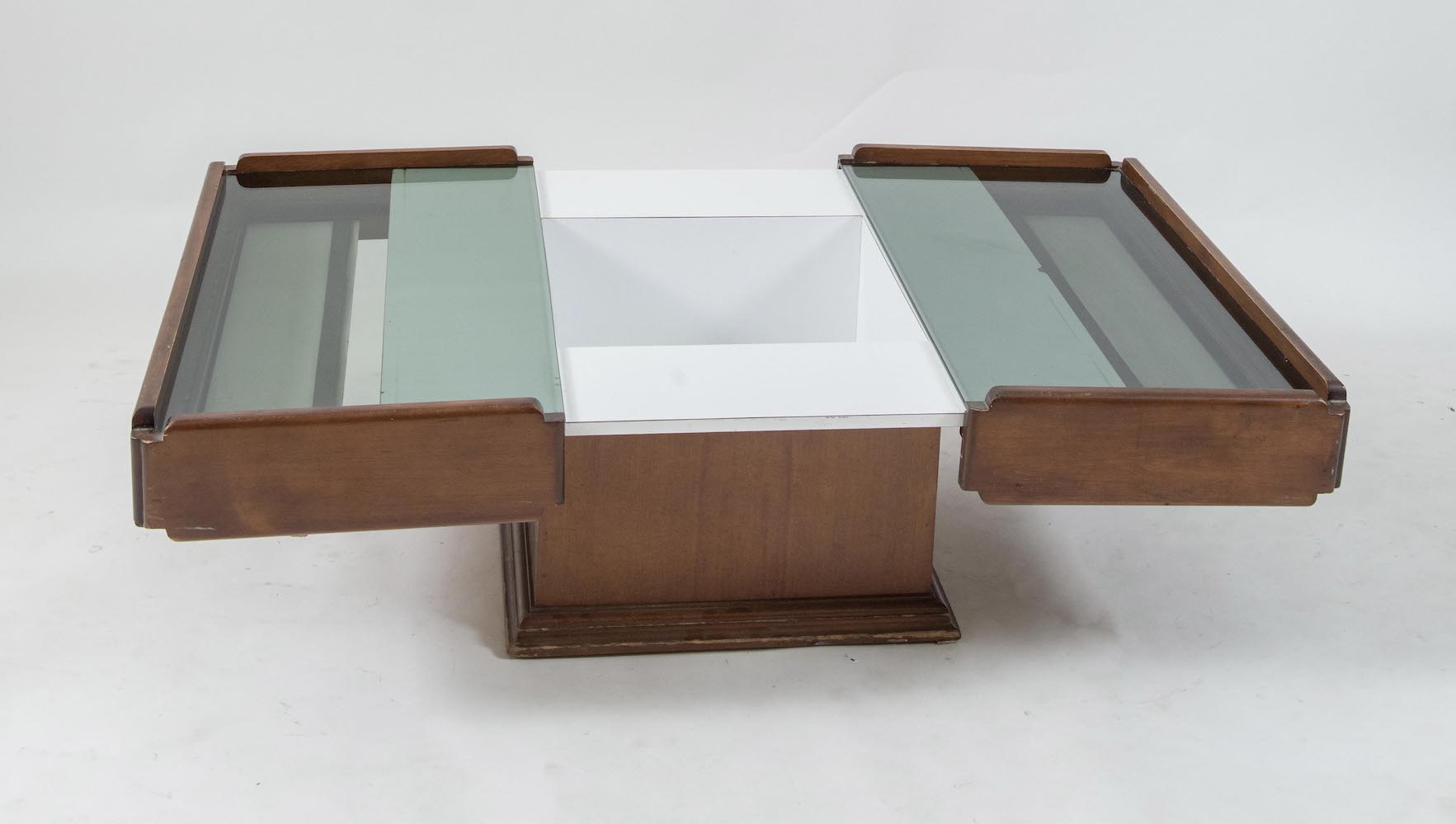 Tavolo da caffè in legno con due ripiani in vetro apribili. Prod. Italia,...