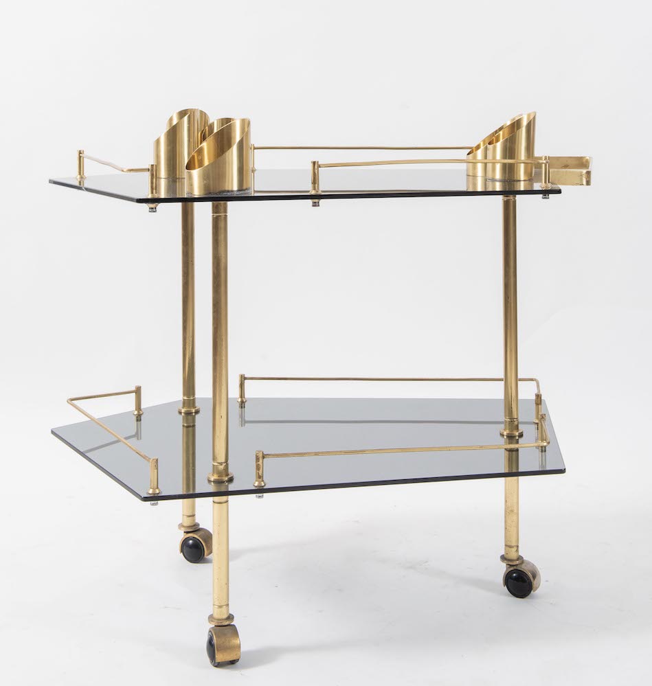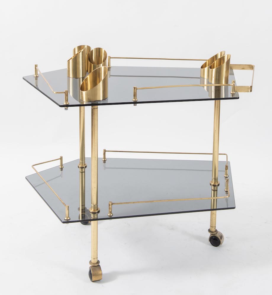 Carrello con struttura in ottone e ripiani in vetro. Prod. Italia, 1970 ca. Cm 97x71x60.