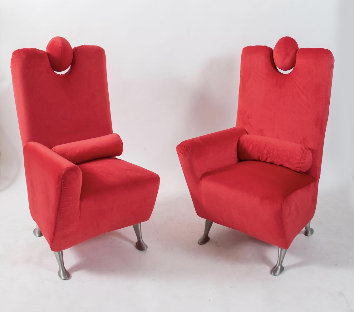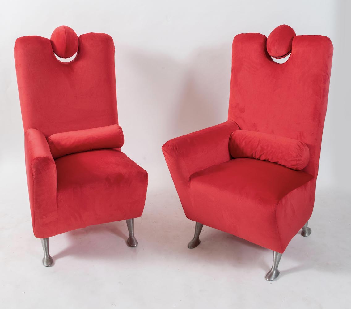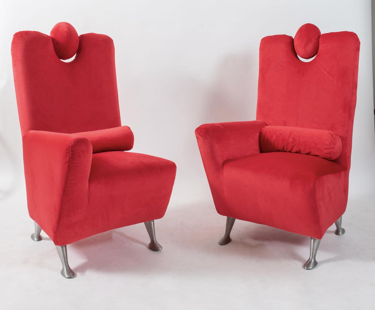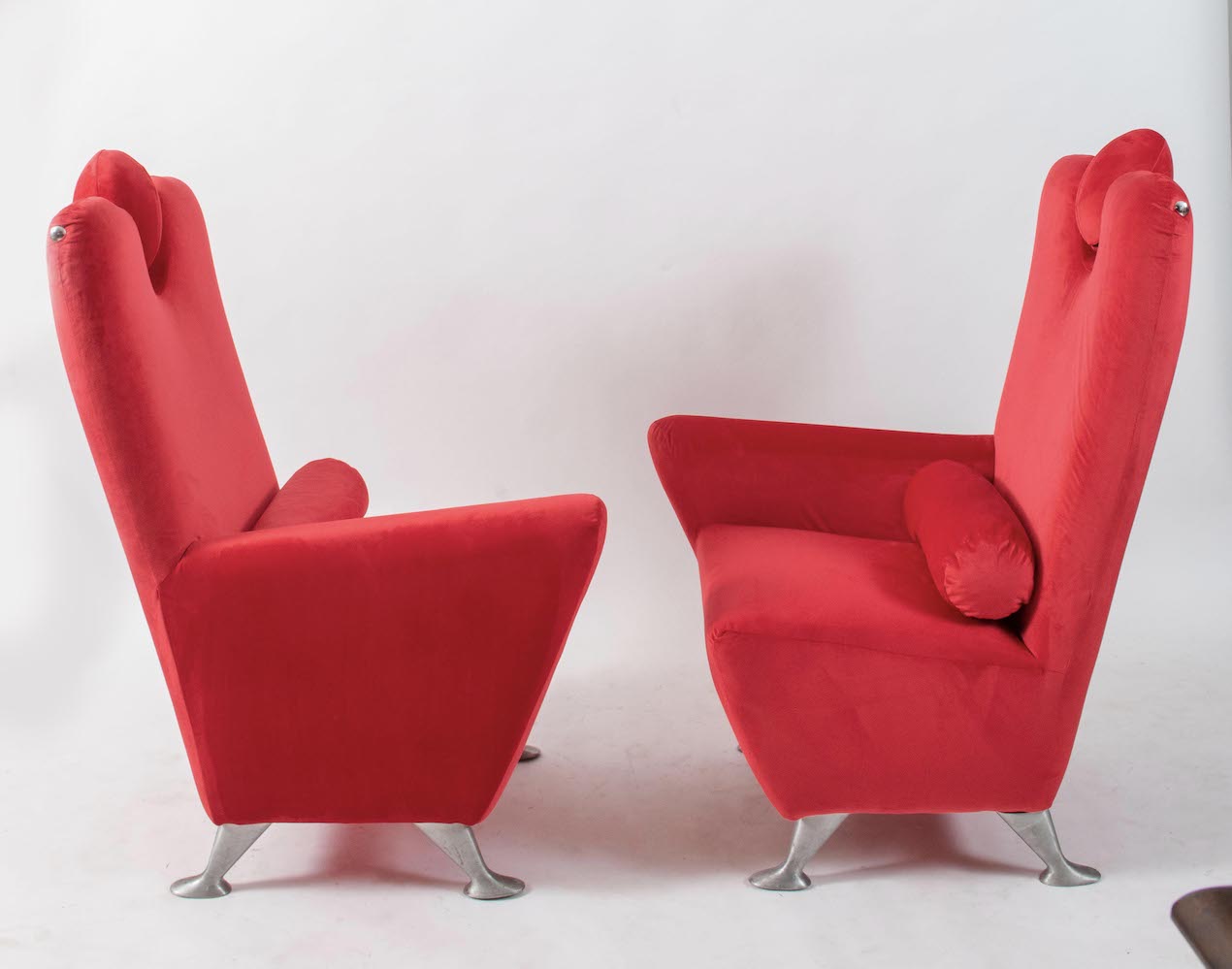 Coppia di poltrone in velluto con poggiatesta girevole e piedi in metallo....