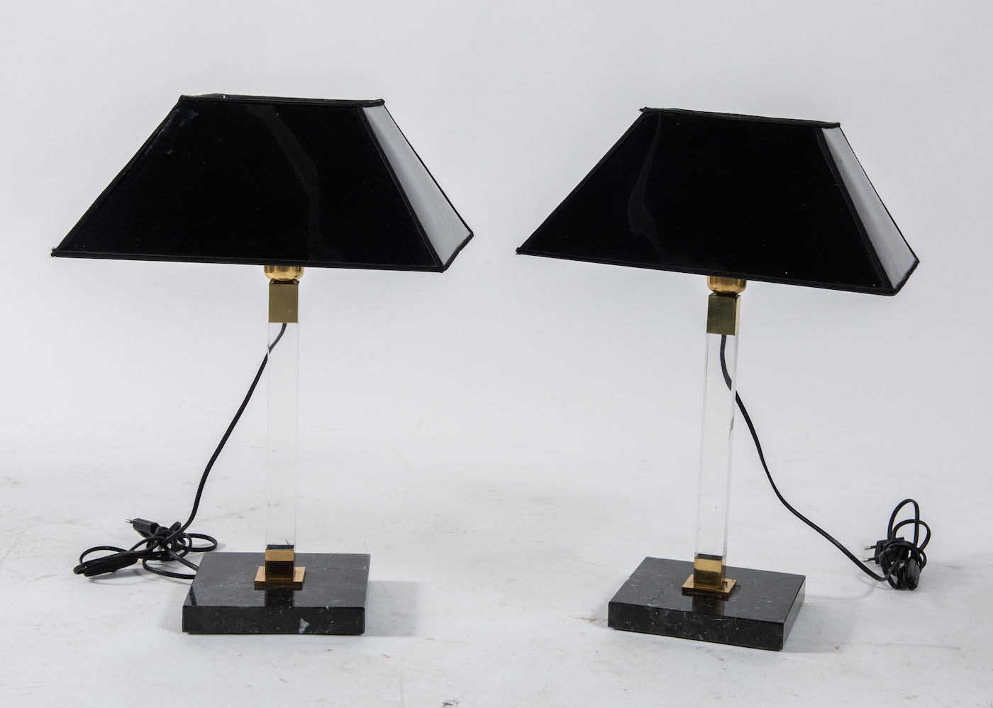 Lotto 206 | Coppia di lampade da tavolo con base in marmo e corpo in plexiglass e ottone,...