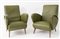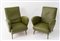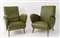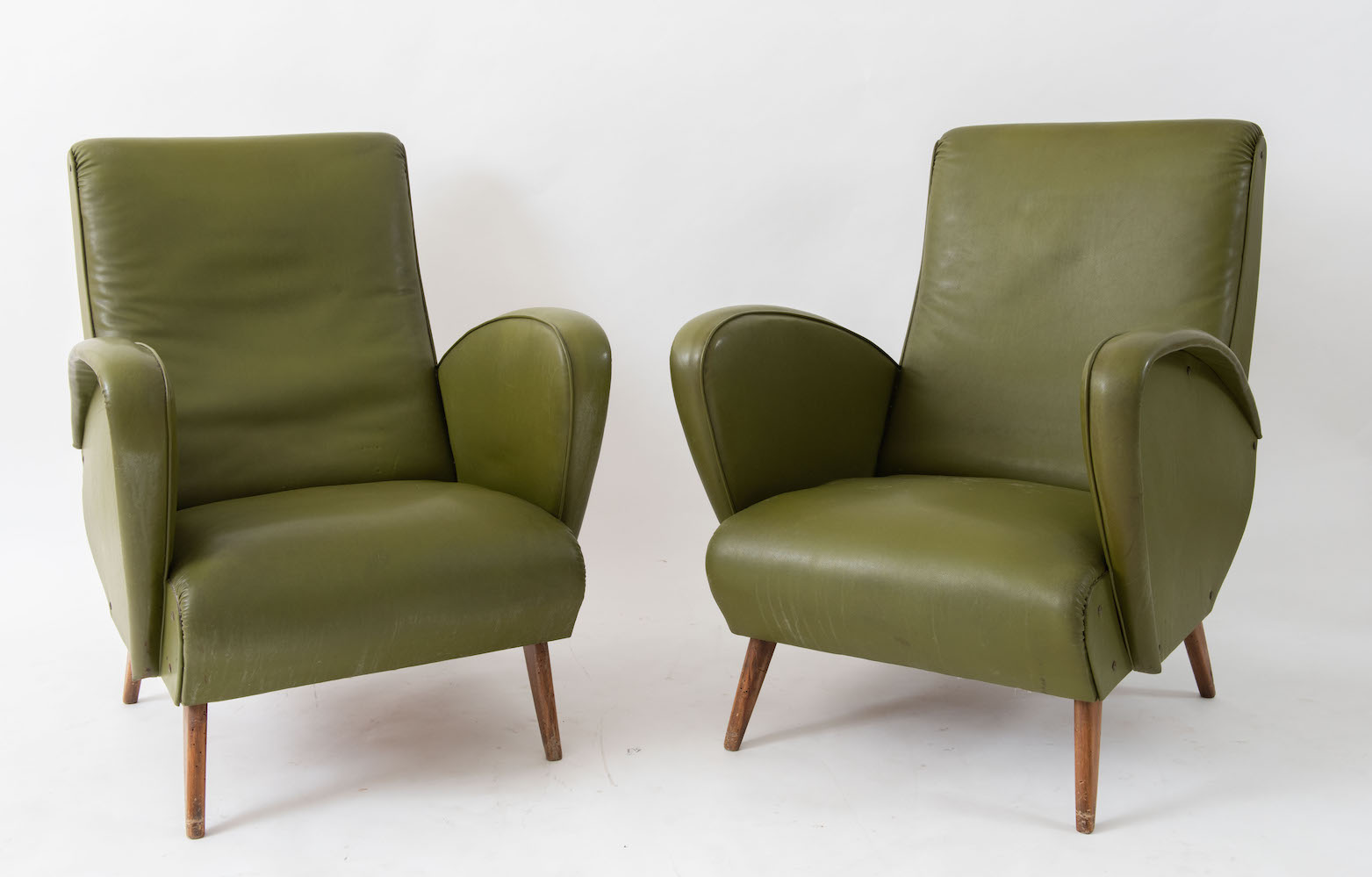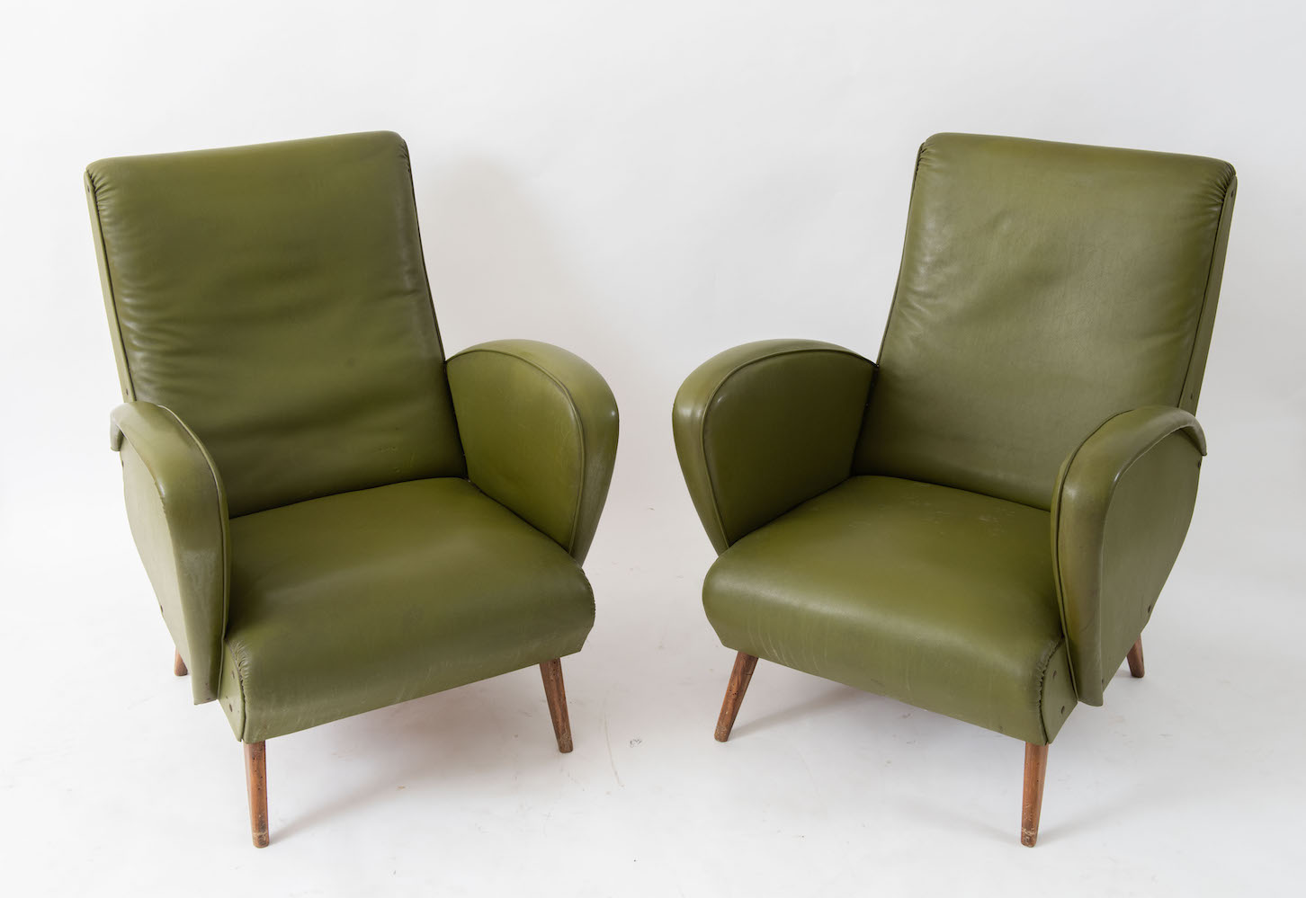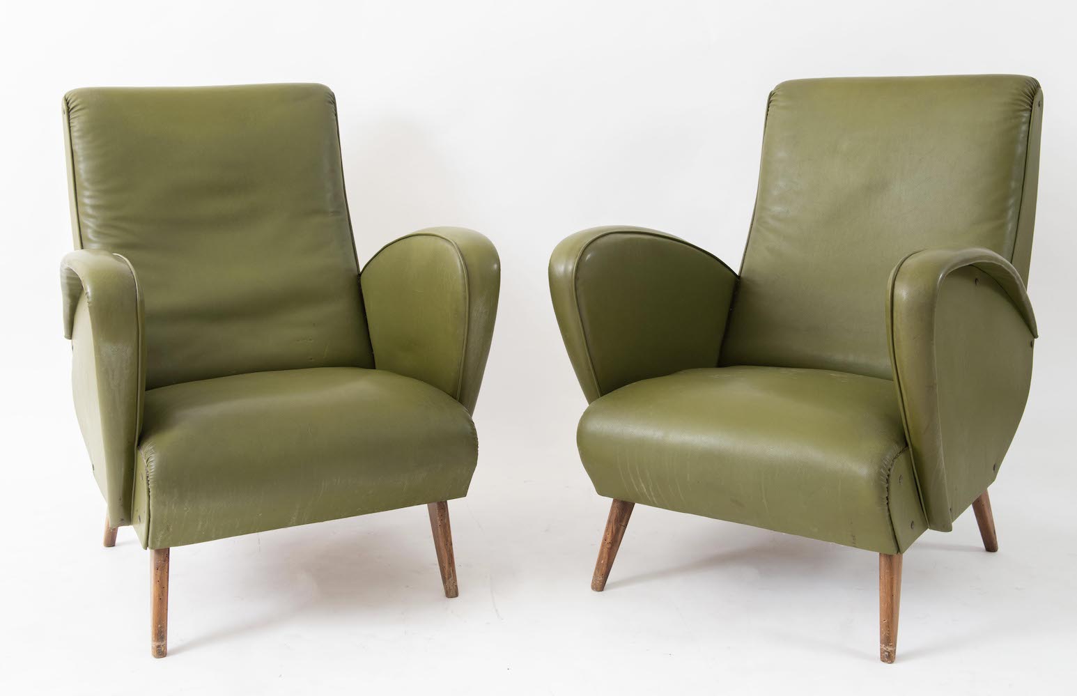 Coppia di poltrone con struttura in legno e rivestite in pelle. Prod. Italia, 1960 ca. Cadauna di cm 81,5x63,5x73.