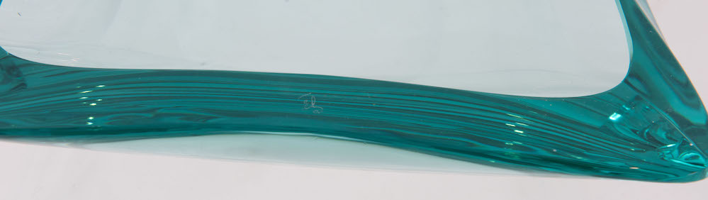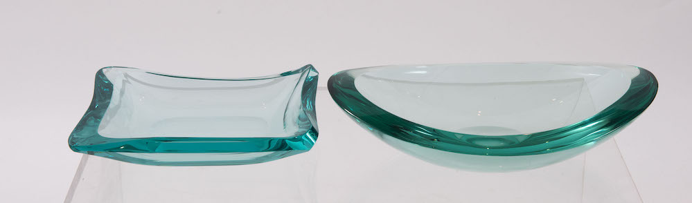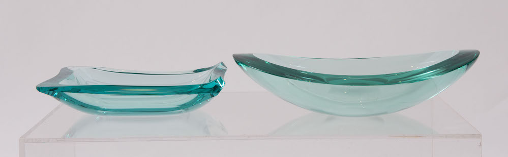 GIORGIO BERLINI Coppia di portaoggetti in vetro. Firma incisa. Prod. Cristal Arte, Italia, 1960 ca. Rispettivamente di cm 23x17,5x4 e cm 33x21,5x6.