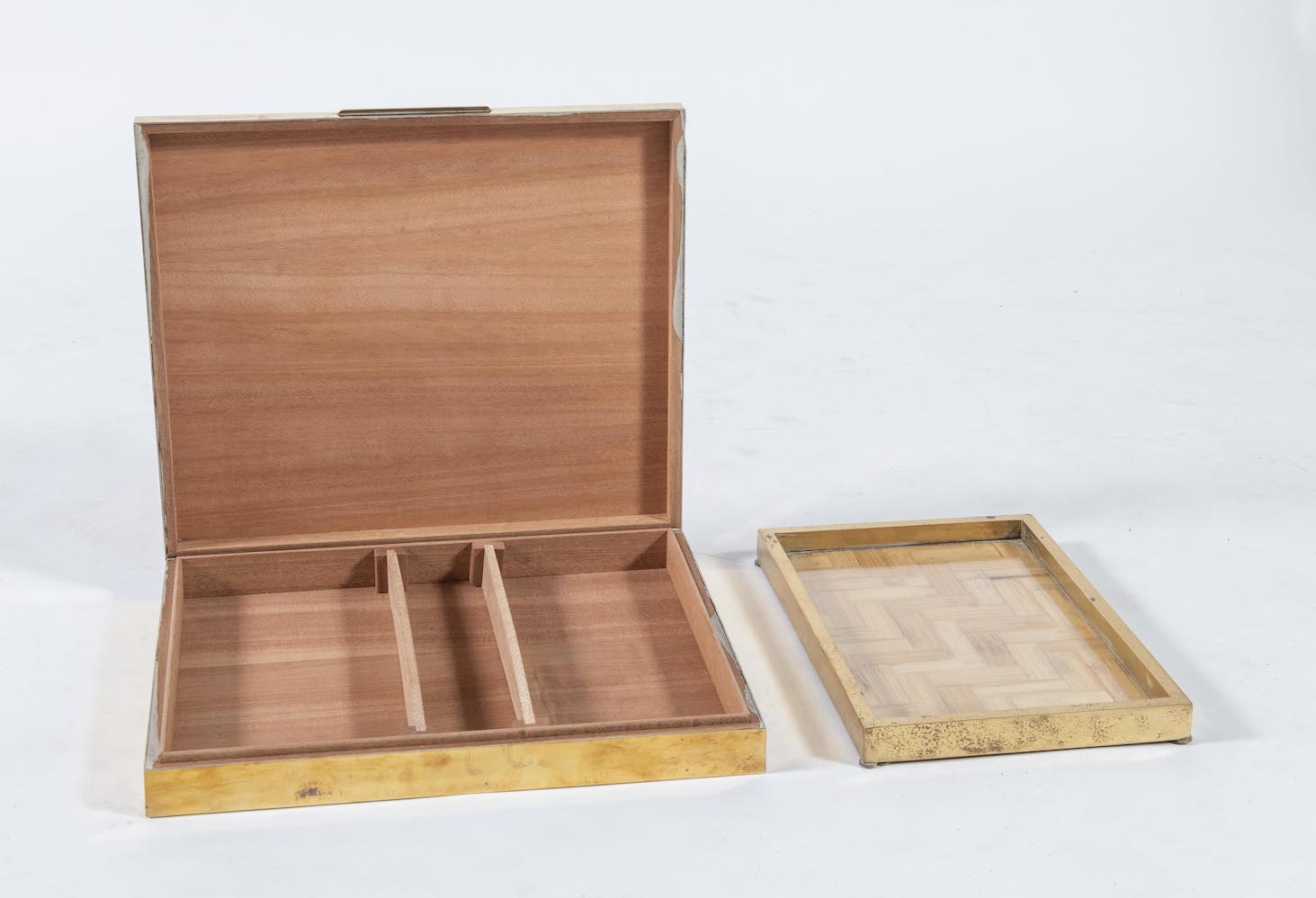 TOMMASO BARBI, attr. Scatola in ottone e legno e vassoio in ottone e bamboo pressato. Prod. Italia, 1970 ca. Rispettivamente di cm 35x30x5 e cm 30x20x2.