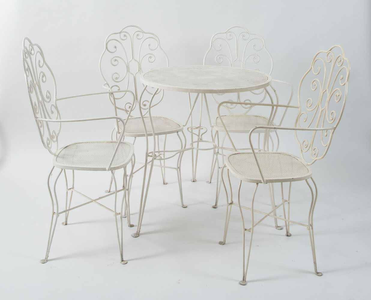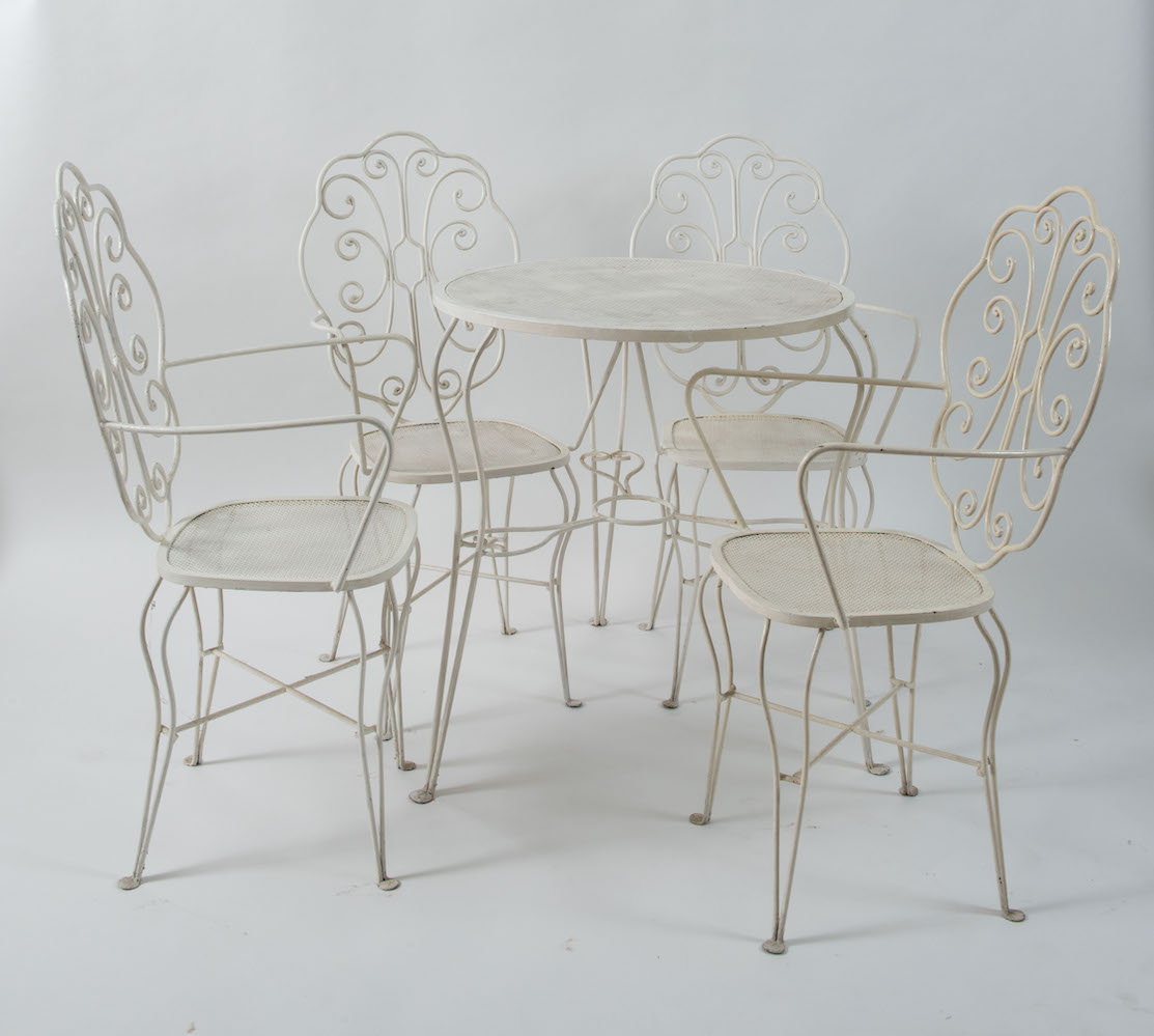 Quattro sedie con tavolo in ferro battuto. Prod. Italia, 1970 ca. Tavolo: cm 71,5x76,5; sedie: cm 98x40x48.