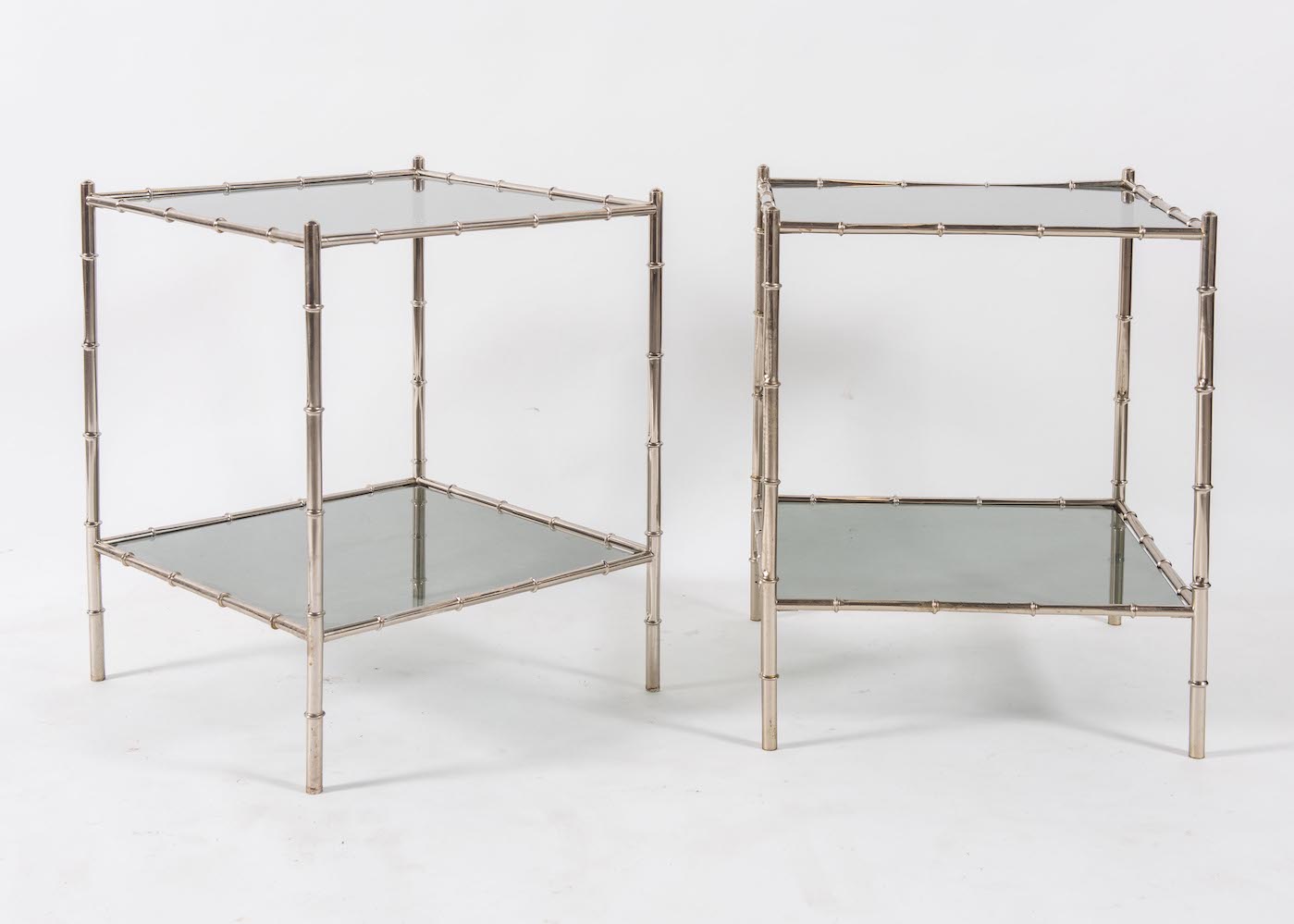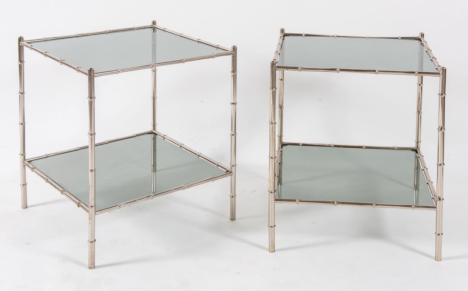 Coppia di tavoli da caffè in ottone e ripiani in vetro. Prod. Italia, 1970 ca. Cadauno di cm 55x45X45.