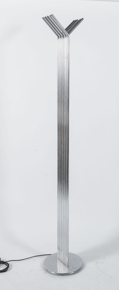 Lampada da terra in metallo cromato. Prod. Italia, 1980 ca. Cm 190x31x31.