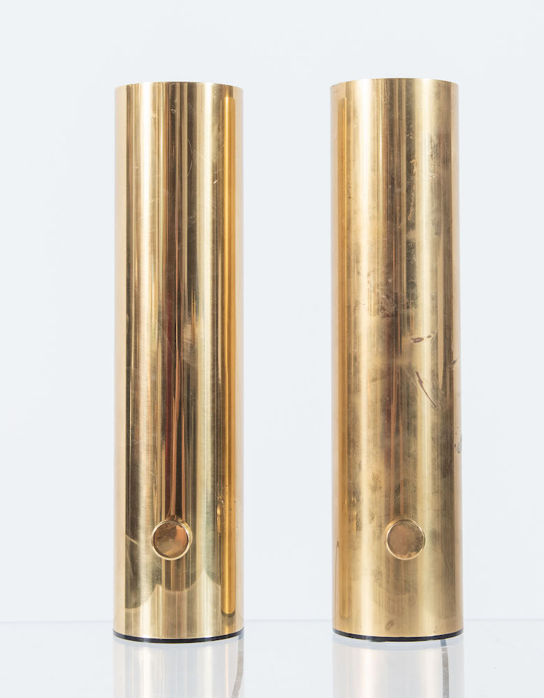 BOTTEGA GADDA Coppia di lampade da tavolo in ottone e metallo. Prod. Bottega Gadda, Italia, 1970 ca. Cadauna di cm 35,5x8,5X8,5. Pubblicazioni: Catalogo Bottega Gadda.