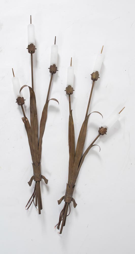 Coppia di applique in ottone bronzato e vetro satinato. Prod. Italia, 1970 ca. Cadauna di cm 113x32x4.