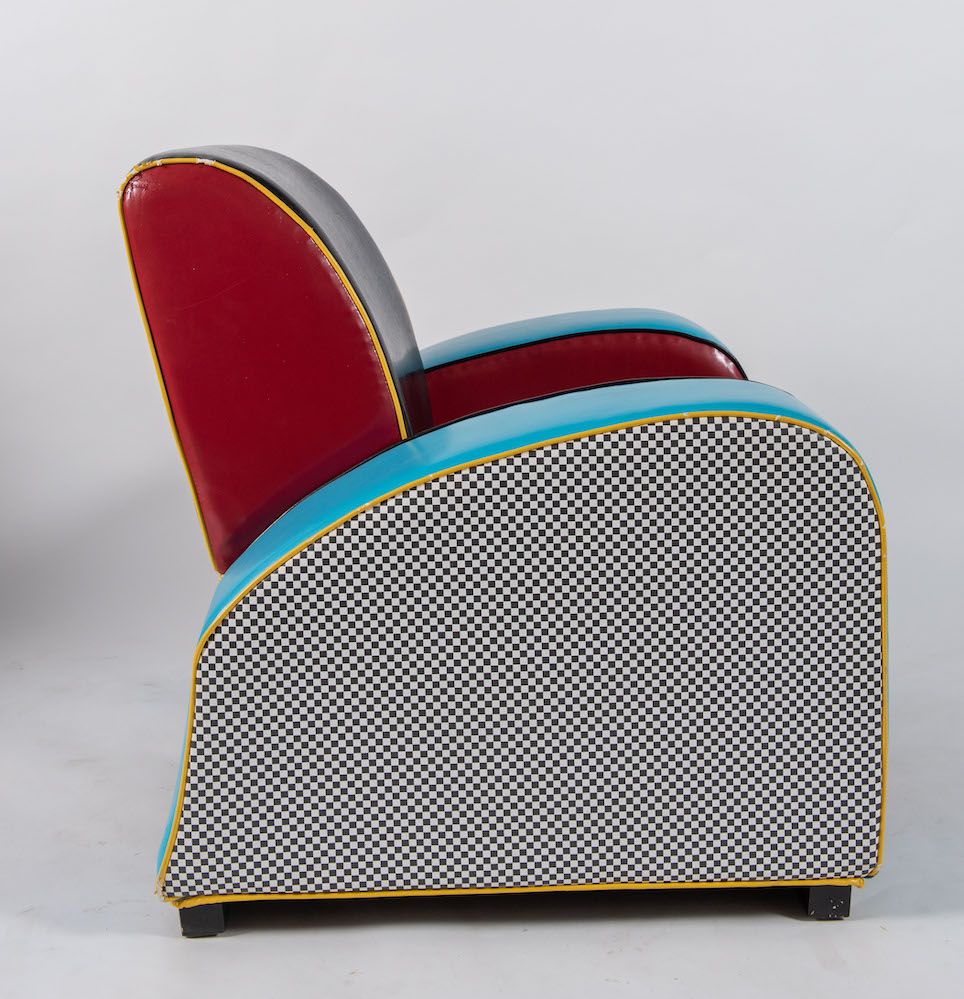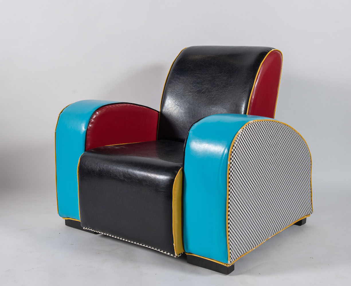 Poltrona in similpelle con struttura in metallo e legno. Prod. Italia, 1970 ca. Cm 82x94x80.