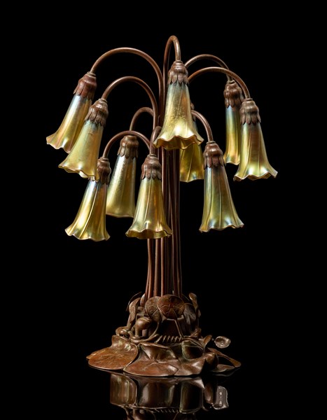 Lampada da tavolo model "Ten Lily". New York, 1910s. Patinated bronze in vegetable shape with leaves and racemes, ten lights with "Favrile" glass corolla diffuser. Marked by incussion under the base "TIFFANY STUDIOS - NEW YORK" and with the numeral 381. Glass inscribed "LCT". (h 52 cm.) (slight defects)