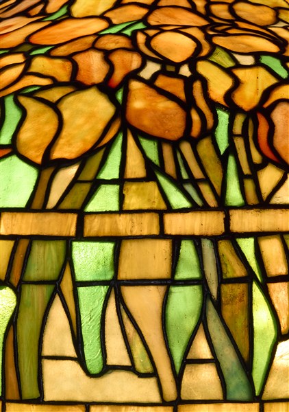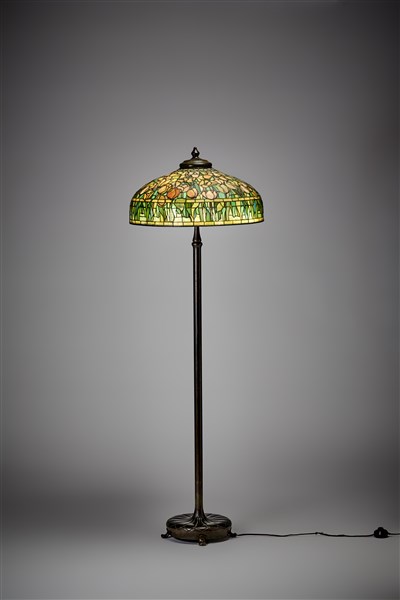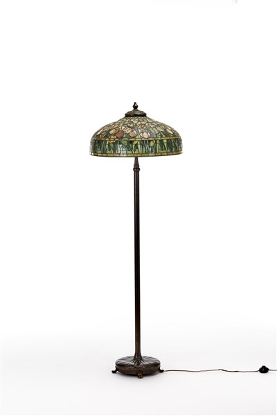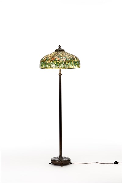 Lampada da terra modello "Tulip". New York, 1915ca. Fusto e base in fusione di bronzo, paralume in tessere di paste vitree policrome montate a piombo, con prevalenza dei toni del verde e raffiguranti tulipani gialli. Marcata a incussione sotto la base "Tiffany Studios New York 25390" e con il monogramma della manifattura "TGDCO" e lungo il profilo inferiore del paralume "Tiffany Studios N.Y. 1548". (h cm 171) (lievi difetti)