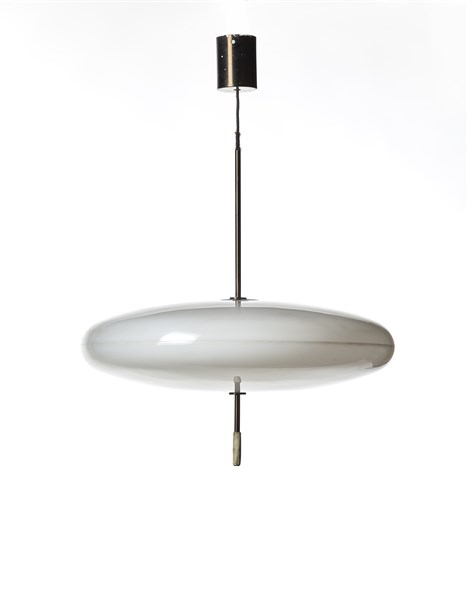 Lampada a sospensione modello "2065 GF". Produzione Arteluce, Milano, anni '50. Metacrilato bianco e metallo verniciato nero. (h cm 75; d cm 52) (lievi difetti)