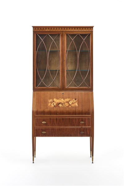 Trumeau con corpo a due cassetti e un'anta ribaltabile con tarsia raffigurante una ghirlanda vegetale su disegno di Giovanni Gariboldi. Alzata a due ante vetrate scandite da ogive in listelli di legno sagomato. Esecuzione Marelli & Colico, Cantù, 1954. Legno di noce Torchio, interni in ulivo, puntali regolabili in ottone e maniglie in fusione di ottone con decoro su disegno di Giovanni Gariboldi, ripiani in vetro. (cm 92x205x42)