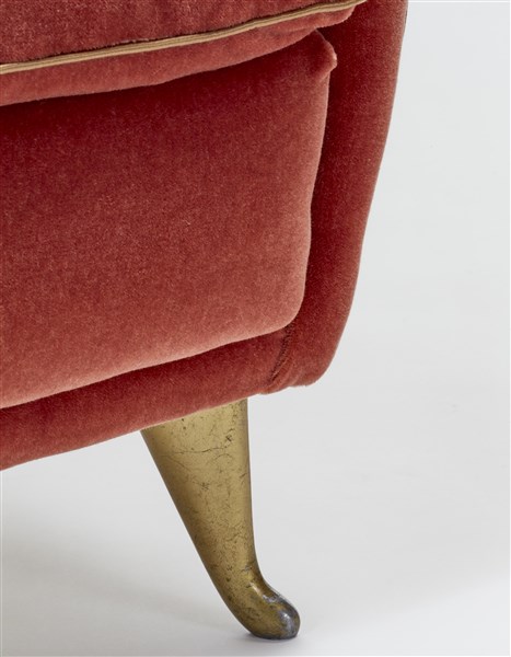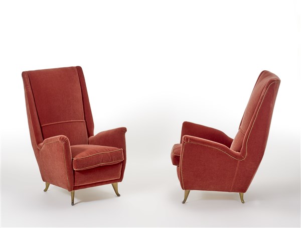 Coppia di poltrone. Produzione ISA, Ponte San Pietro, 1945ca. Struttura in legno, piedi in fusione di ottone, rivestimento in velluto rosso. (cm 69x110x95) (lievi difetti e restauri)