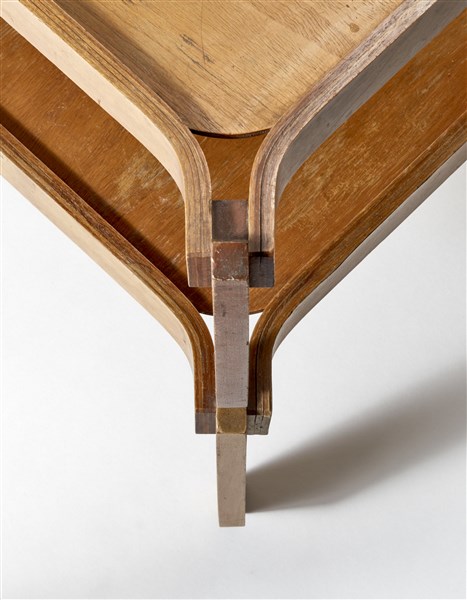 Due tavolini impilabili. Produzione Delitala, Italia, 1959. Legno multistrato e massello di noce. (cm 61x30,5x61) (difetti)