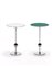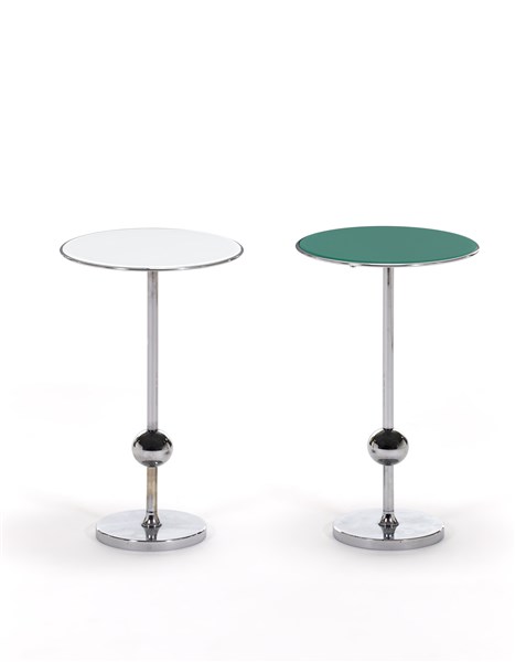 Lot consisting of two service tables of the series "ABV". Produced by Tecno, Varedo, since 1991Chromed metal structure, green and white back-painted glass tops. (h 45 cm.; d 25.5 cm.)