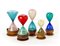 Lot of five bicolor hourglasses of different sizes and designs. Venini, Murano, 1957. Transparent incalmo blown glass. Signed in acid "Venini Murano Italia". Complete with solid wood base. (h max of only the glass 23 cm)