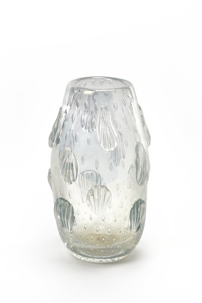 Vaso con applicazione di decori a forma di conchiglia. Murano, anni '30/'40. Vetro trasparente incolore opalescente iridato sulla superficie esterna, con inclusione di bolle regolarmente distribuite. (h cm 28) (lievi difetti)
