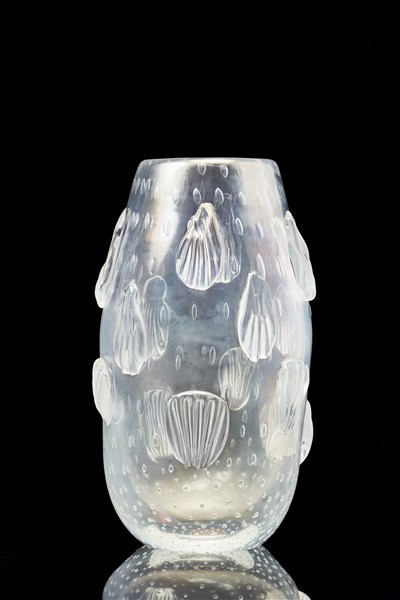 Vase with application of shell-shaped decorations. Murano, 1930s/1940s. Transparent colorless opalescent glass iridescent on the external surface, with inclusion of regularly distributed bubbles. (h 28 cm.) (slight defects)