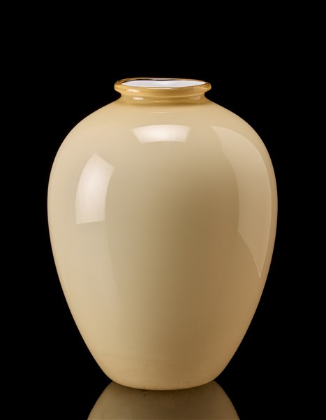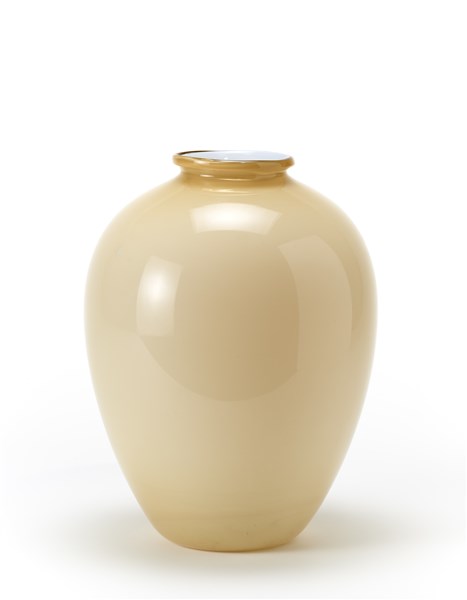 Grande vaso variante del modello 9040. Murano, anni '40. Vetro soffiato incamiciato lattimo e pagliesco. (h cm 35)