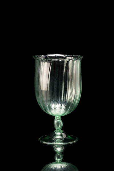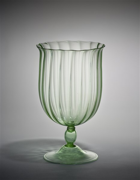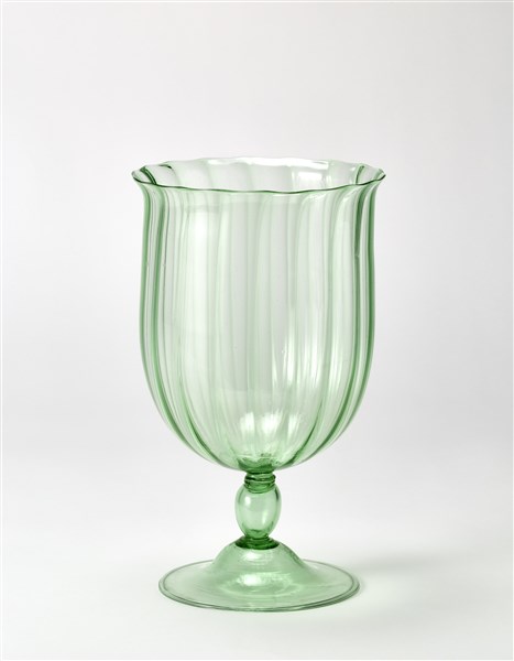 Vaso a calice con corpo costolato, gambo a balaustro e piede a campana applicati a caldo. Esecuzione Venini, Murano, 1925-26. Vetro soffiato verdino trasparente. Corrispondente al disegno di fornace 3085. (h cm 29; d cm 17,5)