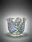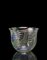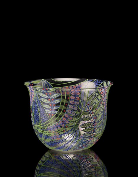 Piccolo vaso. Esecuzione SALIR, Murano, disegno del 1938, esecuzione della seconda metà del secolo XX. Vetro soffiato cristallo, fittamente decorato con smalti blu, verdi, rosa e rossi a motivi vegetali. (h cm 11; d cm 14,3)