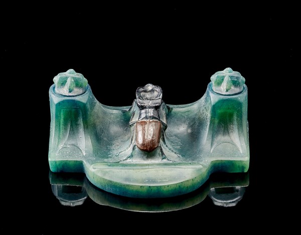 Calamaio. Nancy, inizio secolo XX. Pasta di vetro verde, decorata a rilievo con uno scarabeo nero e marrone. Firmato "A WALTER NANCY - Bergé SC". (cm 17x7,5x11) (lievi difetti)
