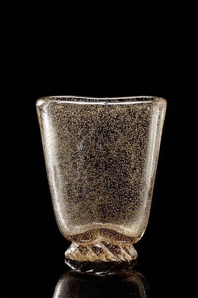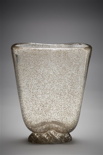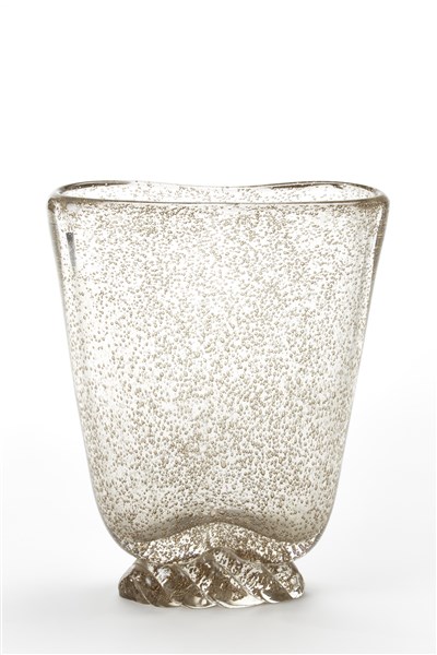 Vaso modello "3908". Esecuzione Seguso Vetri d'Arte, Murano, 1937ca. Vetro soffiato incolore chiaro con inclusione di bolle e ossidi metallici. Corpo rastremato a sezione schiacciata. Base a treccia applicata a caldo. Firma all'acido in corsivo sotto la base: "Seguso Murano". (h cm 34) (lievi difetti)