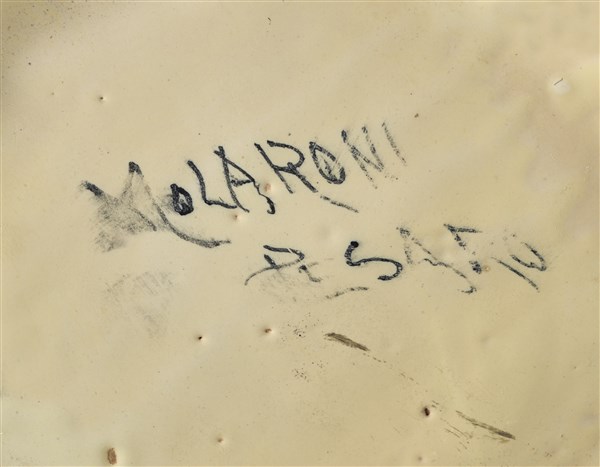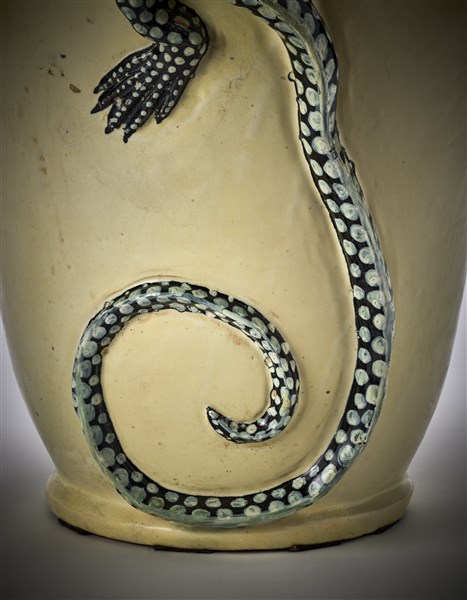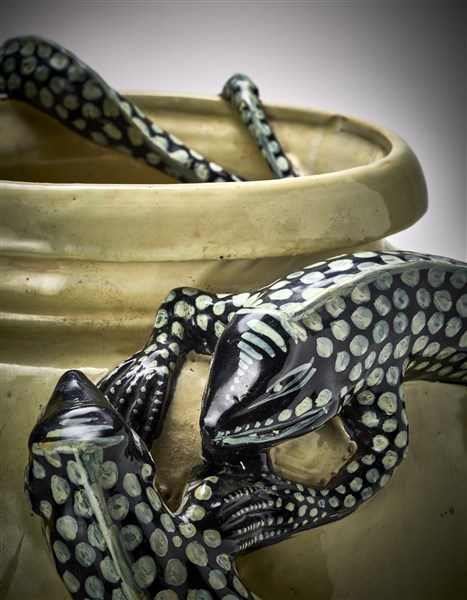 Grande vaso detto "delle lucertole" decorato con quattro grandi salamandre modellate ad alto rilievo. Esecuzione Molaroni, Pesaro, 1915ca. Terracotta smaltata in giallo ocra e modellata a mano con rilievi in nero e verde. Firmata sotto la base "Molaroni Pesaro". (h cm 55,5) (lievi difetti)