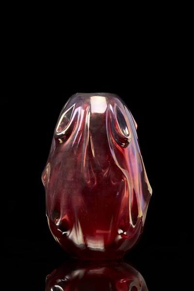 Vaso della serie "induto". Esecuzione Seguso Vetri d'Arte, Murano, anni '40/'50. Vetro trasparente violetto di forte spessore. Forma ovoidale lavorata a bugne irregolari e con superficie esterna fortemente iridata. Disegno e lavorazione analoghi ai modelli 7132, 6432, 7133. (h cm 30) (lievi difetti)