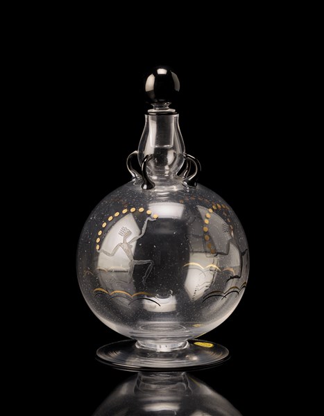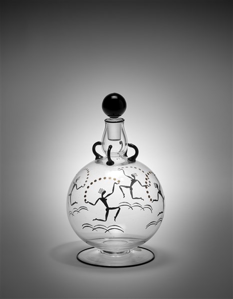 Vaso a bottiglia con tappo. Esecuzione SALIR, Murano, disegno del 1925 ca, esecuzione anni '40/50. Corpo sferico con base applicata e collo stretto a quattro anse in vetro soffiato cristallo, decorato a mano in oro e smalto nero con figure di danzatrici africane. Pomello del tappo, anse e orlo della base applicati a caldo in vetro ametista scuro opaco. Etichetta cartacea della manifattura. (h cm 21; d cm 12)