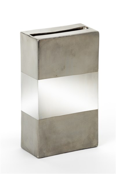 Vase. Execution by Il Sestante / Società Ceramica Toscana, Milan / Florence, 1962-63. Platinum and gray glazed ceramic. Signed under the base "SOTTSASS IL SESTANTE 588 ITALY". (8x26.5x15.5 cm.) (slight defects)