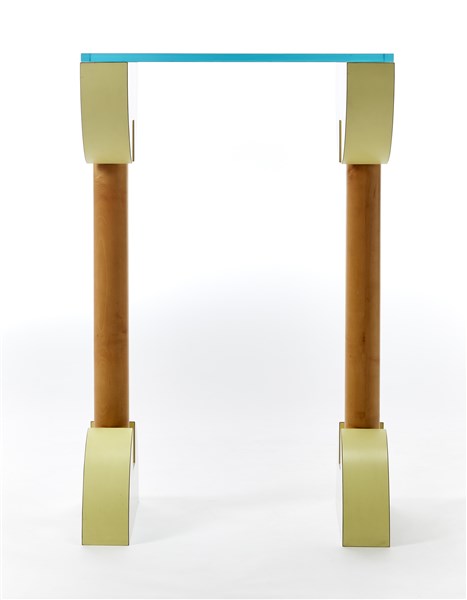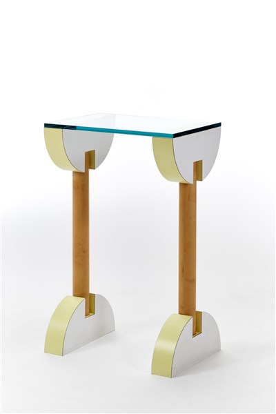 Tavolino alto concepito come arredo complementare ai "Quattro divani stile Biedermeier". Milano, 1982. Basi in legno con rivestimento in laminato bianco e giallo, piano in cristallo. (cm 65x105,5x44,5) (lievi difetti e mancanze)