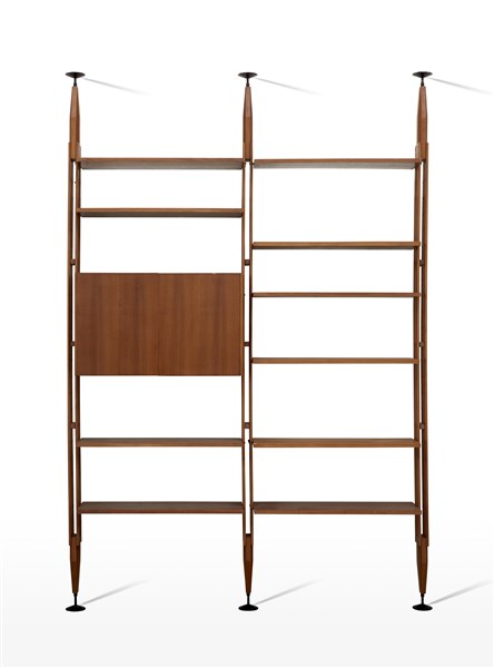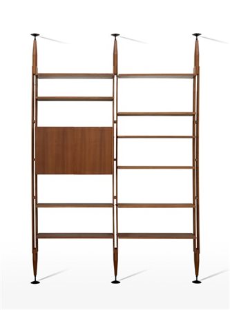 Libreria a due moduli con uno stipo a due ante e dieci ripiani modello "LB7". Esecuzione Poggi, Pavia, 1956. Legno massello, impiallacciato e bordato di teak. (cm 175x248(montanti lignei)x35) (lievi difetti e modifiche)