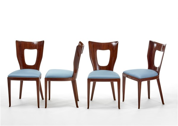 Lotto composto da quattro sedie modello "7388 Triennale". Esecuzione Arredamenti Borsani, Varedo, 1951ca. Legno di mogano massello e seduta in seta azzurra. (cm 45x88x44) (lievi difetti e restauri)