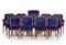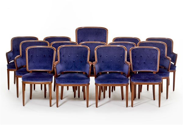 Lotto composto da una poltrona, otto poltroncine e cinque sedie. Svezia, anni '40/'50. Struttura in legno di mogano, rivestimento in velluto blu. (poltrona cm 70x110x50; poltroncine cm 60,5x90x50; sedie cm 50x90x42) (lievi difetti e restauri)