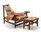 Armchair with footrest model "Jangada Lounge chair ". Produced by Italma, Brazil, 1960. Solid wood, terra di Siena leather upholstery. (armchair 90x82.5x115 cm; footrest cm 64x34x43.5) (defects and minor losses)