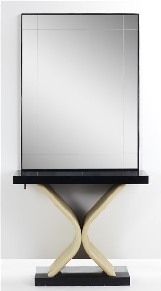 Consolle da ingresso con specchiera. Milano, anni '40. Basamento e piano in legno ebanizzato, sedici fusti inflessi a X in legno laccato crème e cornice della specchiera in legno ebanizzato. (cm 125x105,5+154x50)(difetti)