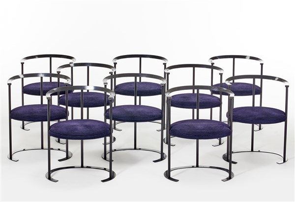 Lotto composto da dieci poltroncine modello "P4 Catilina piccola". Produzione Azucena, Milano, 1962. Struttura in acciaio verniciato grigio, seduta imbottita e rivestita in tessuto a coste blu. (cm 56x71x46) (lievi difetti e restauri)
