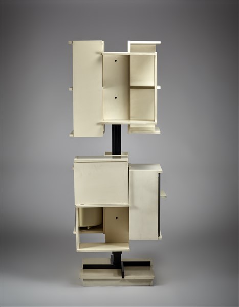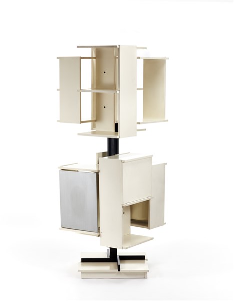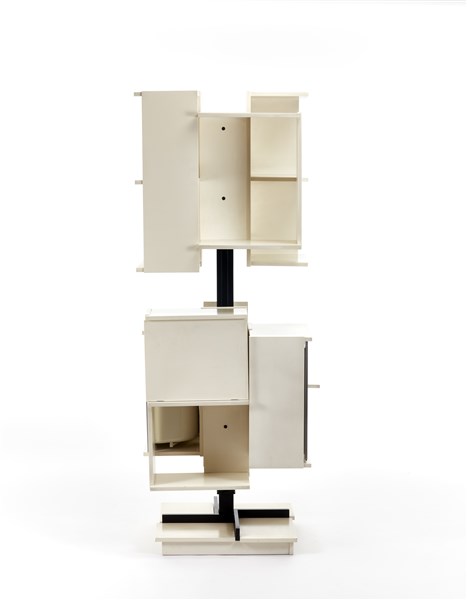 Libreria girevole modello "Centro". Produzione Sormani, Arosio, 1960ca. Metallo smaltato nero, legno laccato bianco, materiale plastico. Rara versione speciale, con impianto stereo giradischi integrato. (h cm 212) (lievi difetti)