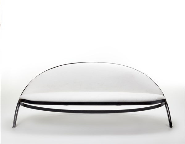Divano modello "Saturno". Produzione Thema, Italia, anni '80. Struttura piattina d'acciaio verniciata nera, seduta rivestita in velluto bianco. (cm 195x70x85) (lievi difetti)